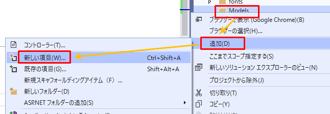 1.「Models」で「追加」→「新しい項目」をクリックします。