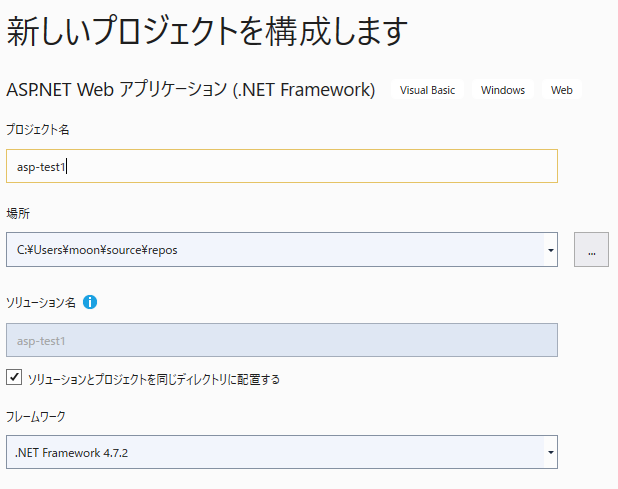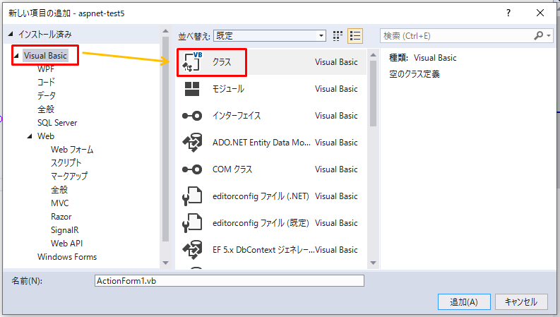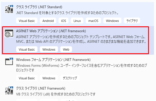 2.Visual Basicの記載がある「ASP.NET Webアプリケーション(.NET Framework)」を選択し