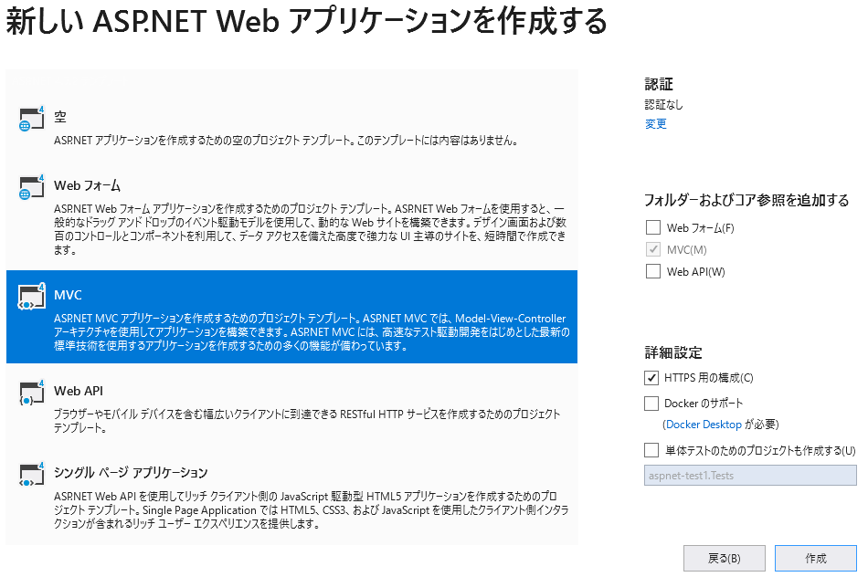 プロジェクト名はasp-test1にしました。「作成」ボタンを押します。