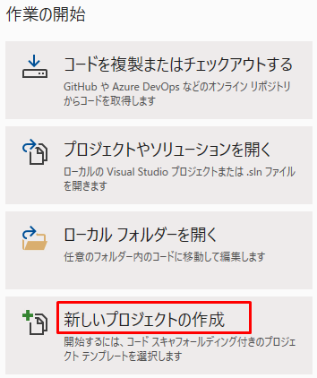 1.Visual Studioを起動し、「新しいプロジェクトの作成」をクリックします。