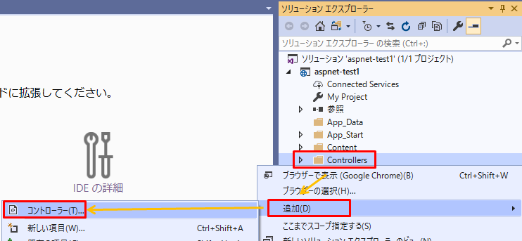 ソリューションエクスプローラーの「Controllers」を右クリックして、「追加」→「コントローラー」をクリックします。