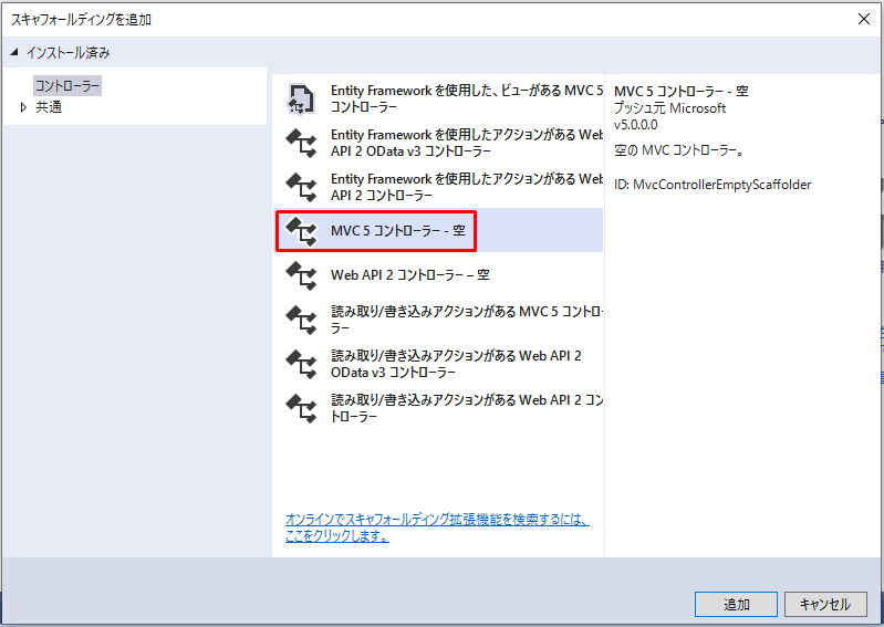 2.「MVC5 コントローラー 空」を選択して追加ボタンを押します。