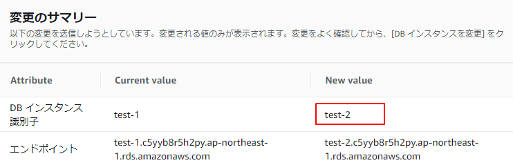 ※DB識別子を変更すると接続で使用するエンドポイントの値も変わります。
