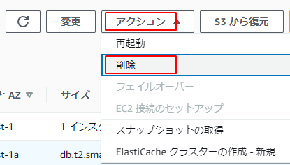 4.クラスターも「アクション」→「削除」をクリックして削除します。