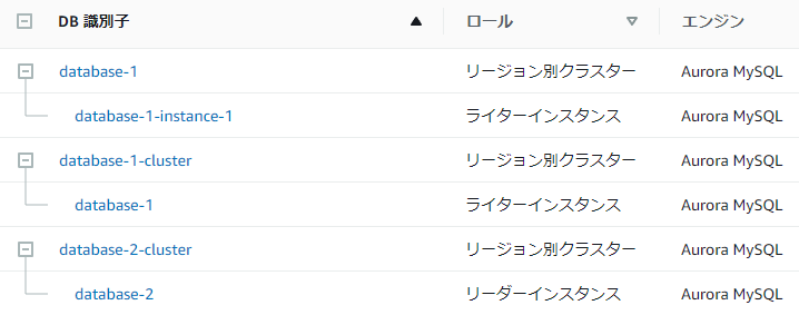 復元したdatabase-1はライターインスタンス、database-2はリーダーインスタンスになっています。