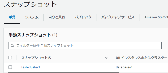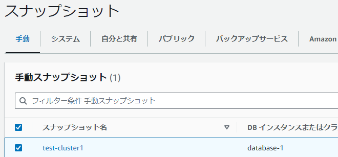 3.スナップショットの一覧です。test-cluster1が表示されています。