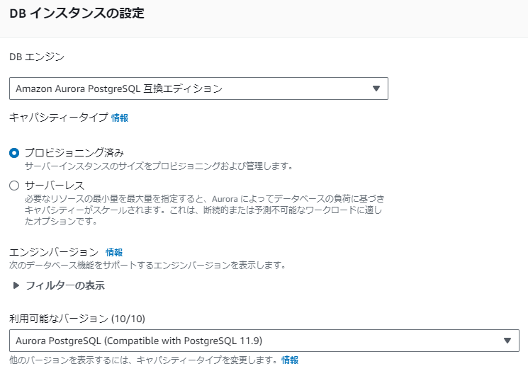 2.DBエンジン、プロビジョニング済み、利用可能なバージョンを選択します。