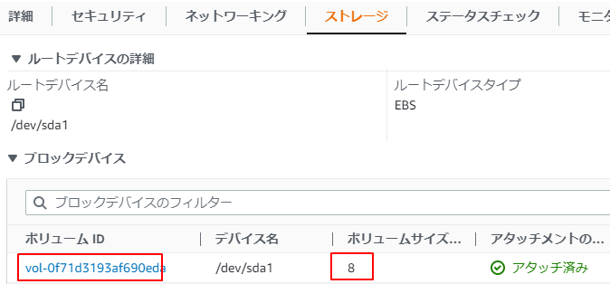 ボリュームサイズは、8(GiB)になっています。