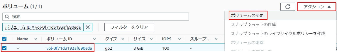 3.ボリュームIDの一覧から対象のボリュームにチェックを入れアクションからボリュームの変更をクリックします。