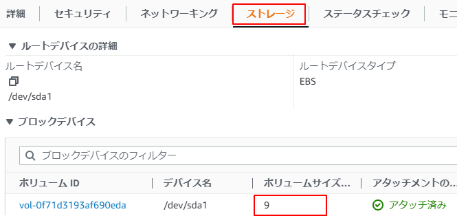 7.インスタンスのストレージタブでは、8から9に変わっています。
