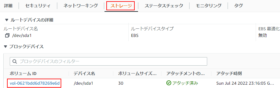 2.ストレージタブをクリックしボリュームIDのリンクをクリックします。