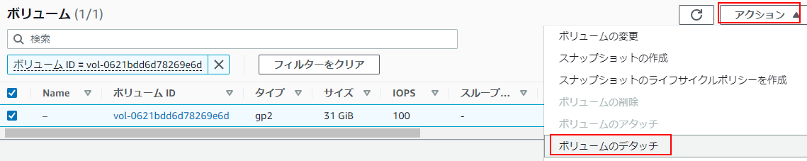 3.ボリュームの一覧で対象のボリュームにチェックを入れ、アクションからボリュームのデタッチをクリックします。ボリュームがデタッチされます。