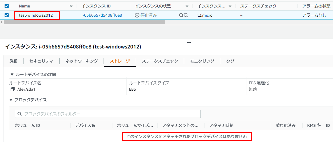- EC2(Windowsサーバ)のボリュームをデタッチ(取り外し)します。