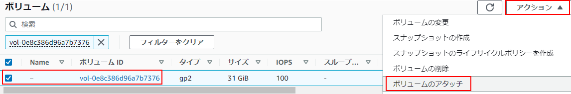 1.アタッチするボリュームにチェックを入れ、アクションからボリュームのアタッチをクリックします。