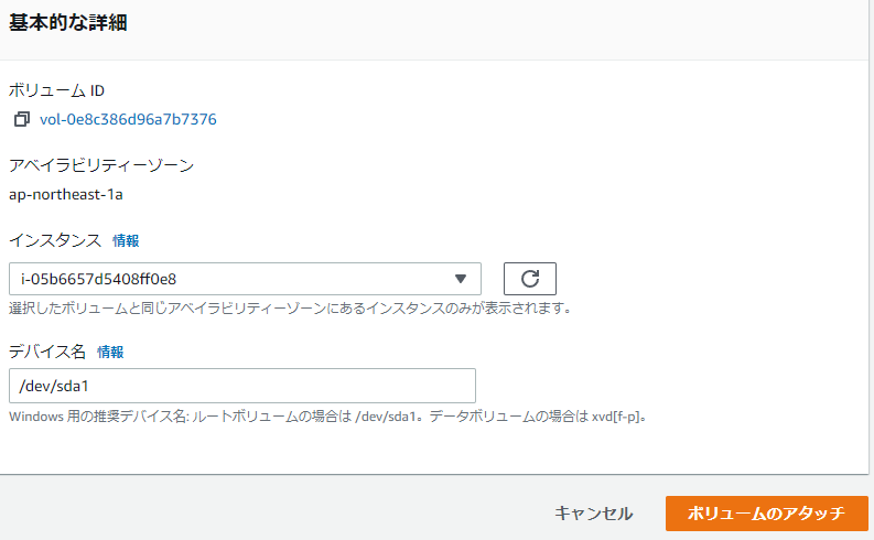 | ボリュームをインスタンスにアタッチ(取り付け)する |