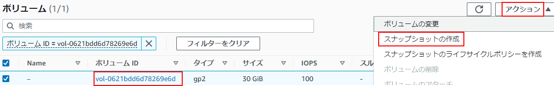 3.ボリュームIDの一覧から対象のボリュームにチェックを入れアクションからスナップショットの作成をクリックします。