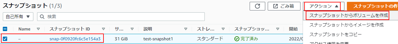 1.スナップショットの一覧で対象のスナップショットにチェックを入れアクションからスナップショットからボリュームを作成をクリックします。