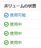 3.ボリュームの一覧を確認すると作成したボリュームはまだどこにもアタッチ(つける)していないので使用可能となっています。