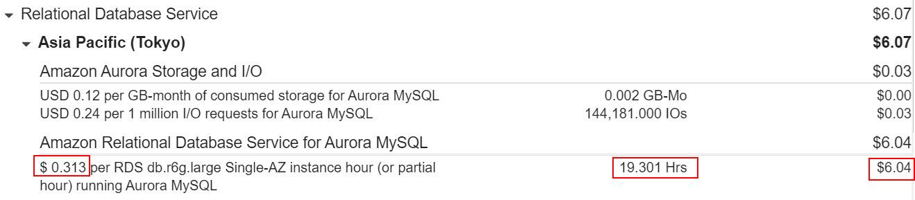 このサンプルのAurora(MySQL)でかかった金額