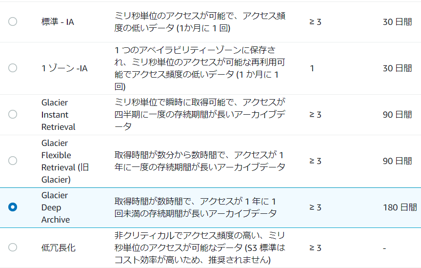 ※ファイルアップロード後でも「Glacier Deep Archive」に変更可能です。