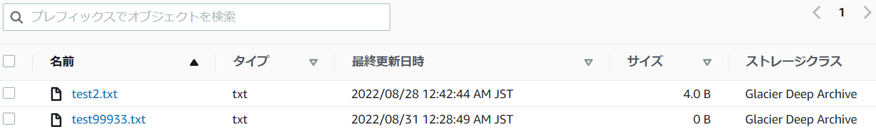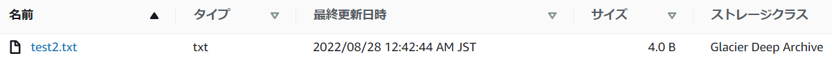 4.オブジェクトの一覧を表示するとストレージクラスはGlacier Deep Archiveになっています。