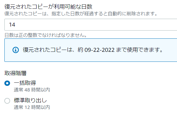 3.「復元されたコピーが利用可能な日数」に数値を入力すると下の欄に「復元されたコピーは、約MM-dd-yyyy」まで使用できます。」と使用できる日数が表示されます。