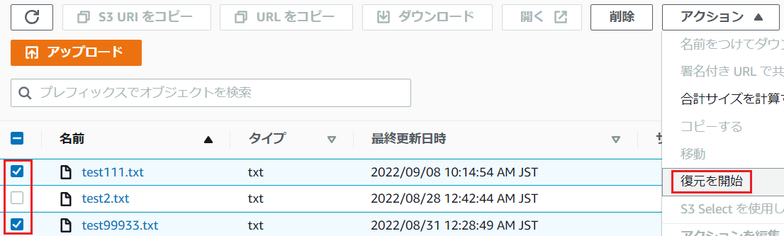 1.S3でGlacier Deep Archiveのファイルを選択してもダウンロードボタンは押せません。ファイルの復元が必要です。