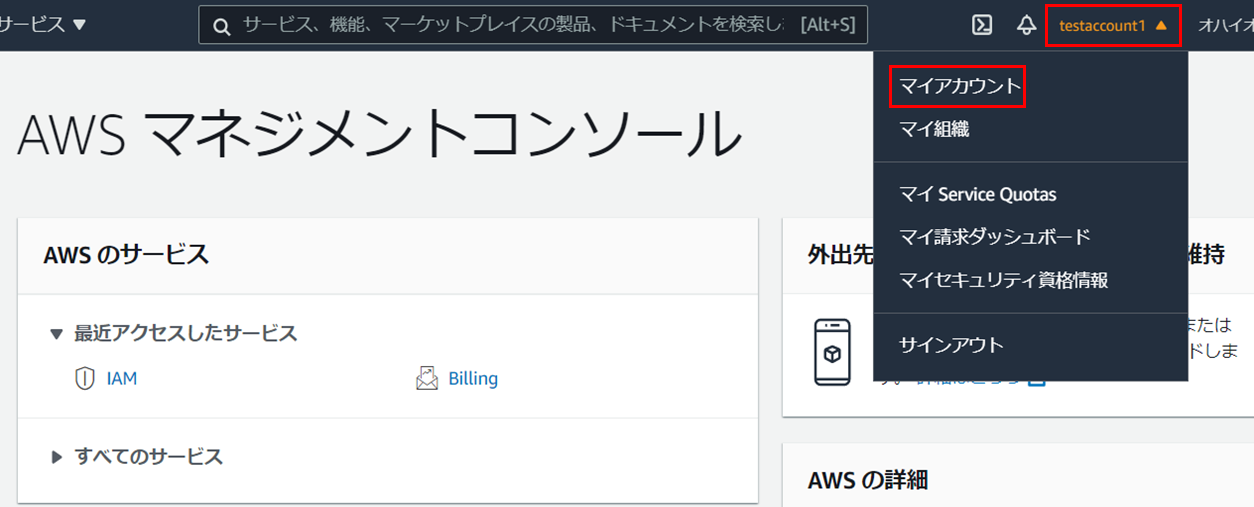 2.ルートユーザの「アカウント名」をクリックし、「マイアカウント」をクリックします。