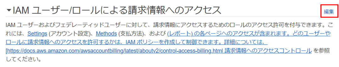 3.下の方にスクロールし、「IAM ユーザー/ロールによる請求情報へのアクセス」の横にある「編集」をクリックします。