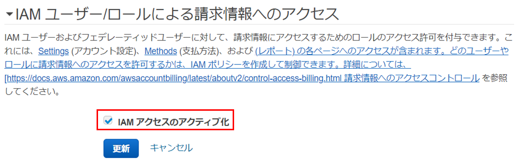 4.「IAMアクセスのアクティブ化」にチェックを入れ更新ボタンを押すとIAMユーザーに請求情報が表示されるようになります。