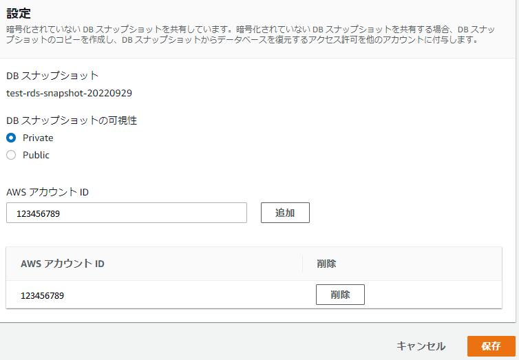 6.DBスナップショットの可視性をPrivateにして共有先のAWSアカウントIDを指定し追加ボタンを押すと下の一覧に表示されます。保存ボタンを押すと共有されます。