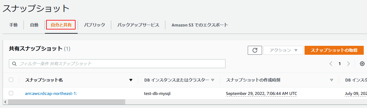 1.RDSのスナップショットの一覧では、「自分と共有」タブに表示されます。