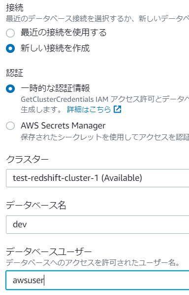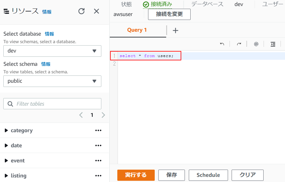 | クエリエディタでRedshiftに接続してSQLを実行 | |