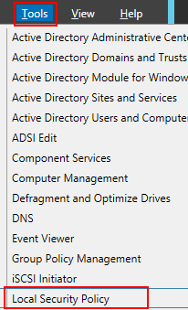 2.Server Managerの右上にあるTools>Local Security Policyをクリックします。