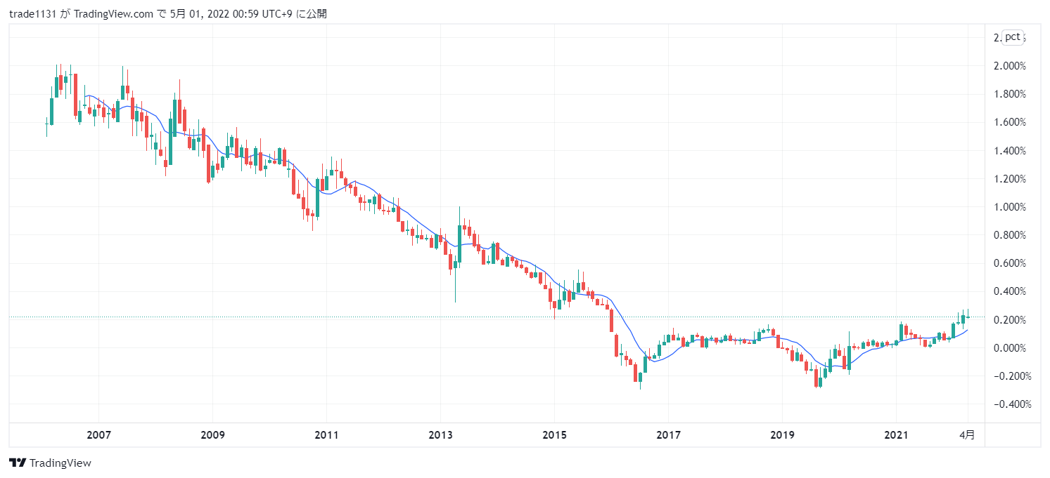 以下は、2006年~2022年の日本国債10年物利回りのチャートです。