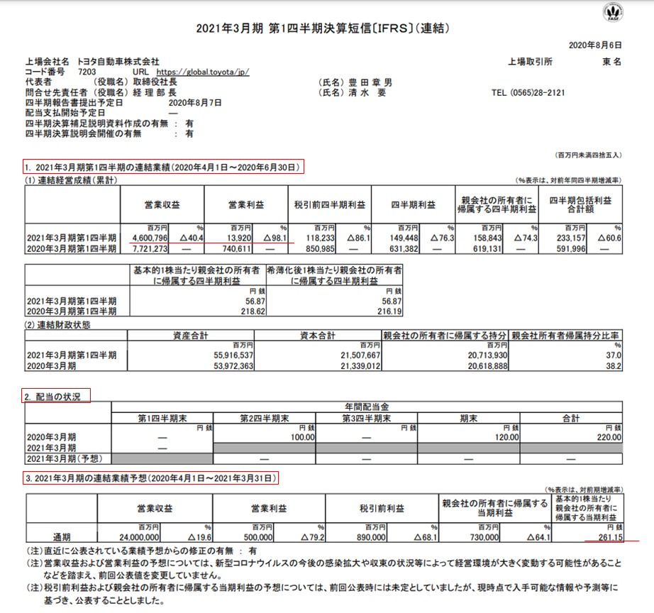 トヨタ自動車株式会社の2020年4月1日~2020年6月30日の決算短信の1ページ目です。