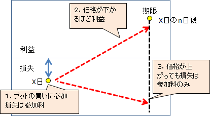 ある期限の時に、予想した価格よりも価格が下がっていた場合、価格から参加した費用を引いた額が利益になります。価格が下がれば下がるほど利益になります。