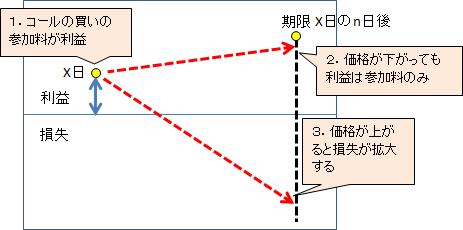 ある期限の時に、予想した価格よりも価格が上がっていた場合、参加した費用のみが損失になります。