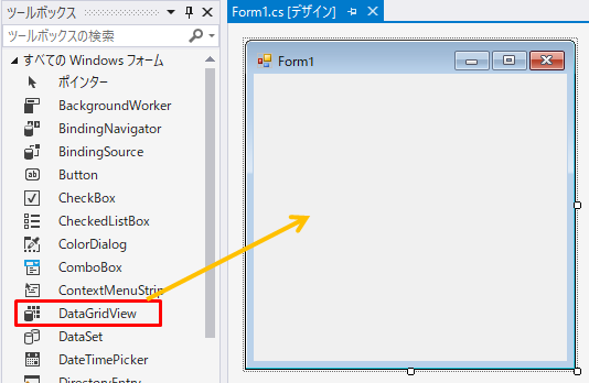 1.「ツールボックス」の「DataGridView」をフォームにドラッグアンドドロップします。
