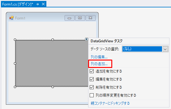 2.DataGridViewの右上にある(下の赤枠)三角をクリックするとDataGridViewタスクが表示されます。