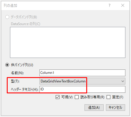 「型」は、DataGridViewTextBoxColumnで、「ヘッダーテキスト」は、任意の名称をつけ「追加」ボタンを押します。