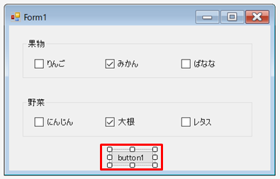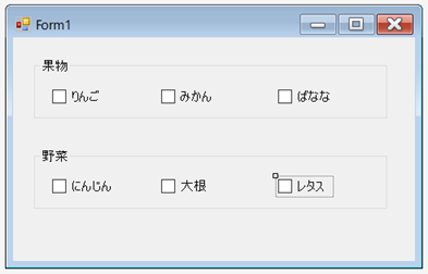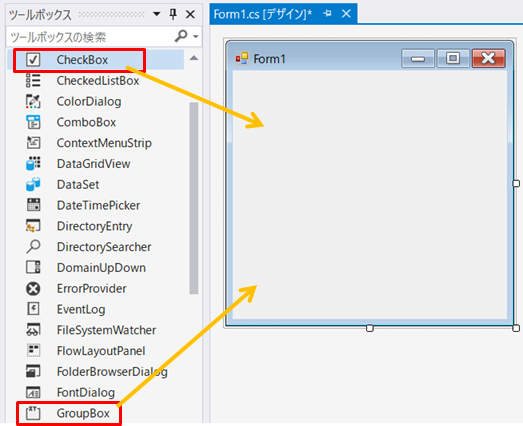 「ツールボックス」の「GroupBox」と「CheckBox」をフォームにドラッグアンドドロップします。