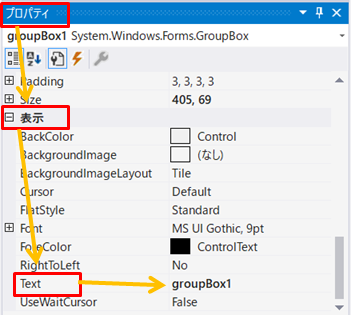 4.プロパティの「表示」の「Text」の欄に名前を入力します。