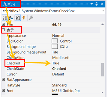 2.プロパティの「表示」の「Checked」の欄を「True」にします。