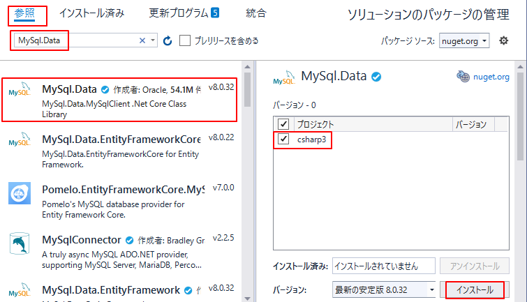 表示されたMySql.Dataをクリックし、プロジェクトのチェックを入れ、インストールボタンを押します。