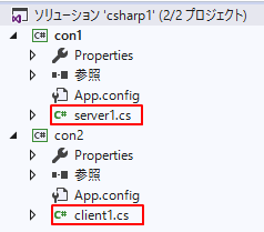 server1.csがサーバー側でclient1.csがクライアント側です。