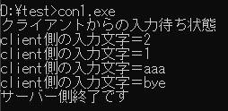 2.exeファイルを任意の場所に配置します。その後、コマンドプロンプトを2つ立ち上げ、先にサーバー側のcon1.exeを起動し、次にクライアント側のcon2.exeを起動します。