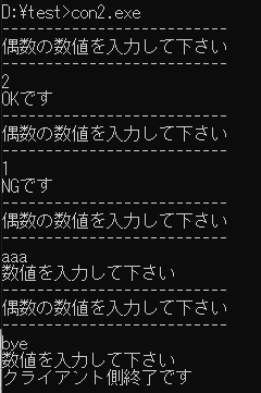 byeと入力するとサーバー側とクライアント側の処理が終了します。