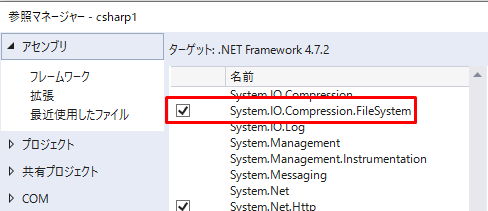 System.IO.Compression.FileSystemを選択します。