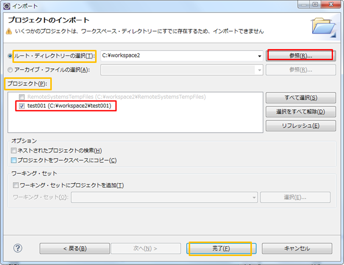 4.「ルートディレクトリの選択」で参照ボタンを押して「workspace2」フォルダを選択し